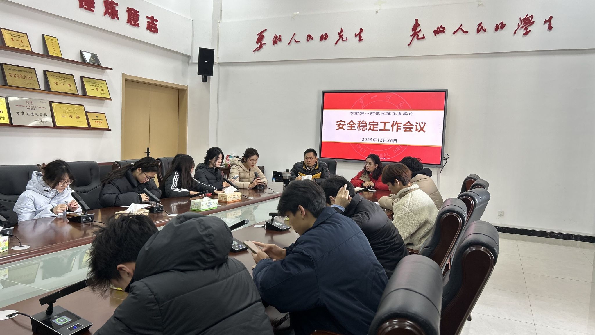2025年12月26日,湖南第一师范学院体育学院学生安全稳定工作会在211会议室举行。学工办主任叶晶、分团委书记兼学生党支部书记唐智鹏及分团委、学生会各部门负责人、全体学生党员参会,共同筑牢校园安全防线。